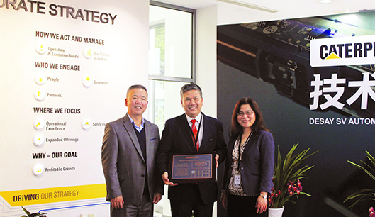 卡特彼勒技術研發(中國)有限公司董事長兼總經理尚爾兵博士(左)、卡特彼勒生產系統Nancy Jiang女士(右)與德賽西威副總經理Azmoon Ahmad先生(中)在授牌儀式上合影